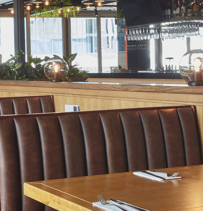Installation required close coordination with mechanical, electrical and kitchen equipment trades. The cabinetry integrates seamlessly with the industrial-style ceiling, feature lighting and branded wall elements, creating a welcoming space that performs night after night.